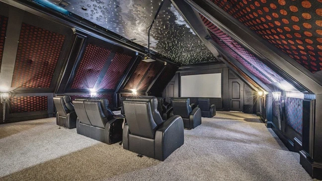 Real estate listings describe amenities such as dedicated entertainment areas, including a movie theater, salon room, and game rooms, as well as open interiors that focus natural light.